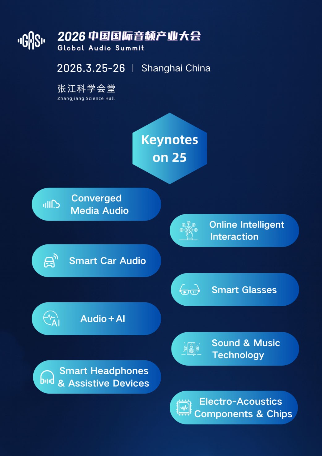 GAS 2026 presents 1 keynote and 8 Featured Sessions covering Converged Media Audio, Smart Car Audio, Audio+AI, Smart Headphones and Assistive Devices,Online Intelligent Interaction, Smart Glasses, Sound & Music Technologies,